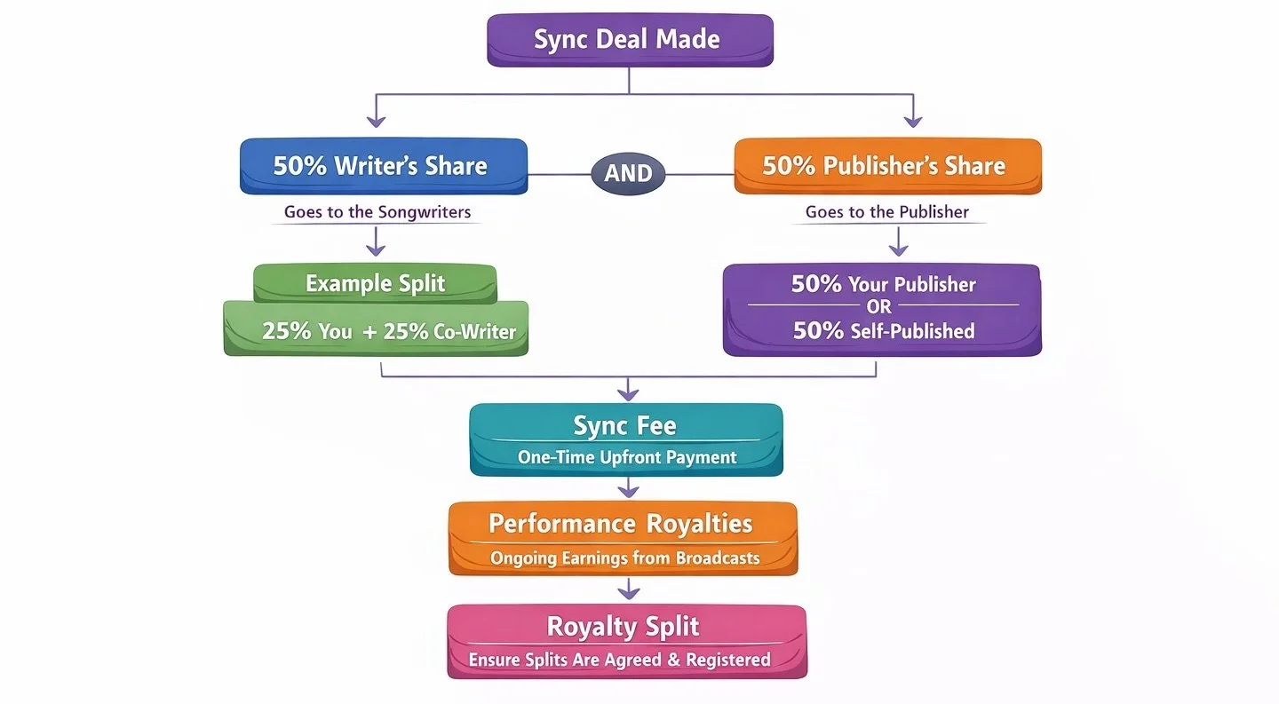 Understanding sync royalty splits is an important part of building a sustainable career in music, because it helps you know exactly how you get paid when your song is placed in TV, film, advertising, or games. In most sync deals, the income is divided into two halves — the writer’s share (50%) and the publisher’s share (50%). The writer’s share belongs to the songwriter or composer and is paid through your performing rights organisation, while the publisher’s share goes to whoever controls the publishing, which could be you, a publisher, or a company representing the track. For example, if you co-write a song with one other writer and you agree on a 50/50 split, each writer would receive 25% writer’s share, and the remaining 50% publishing would either be split the same way or go to a publisher if one is involved. When a song is synced, there is usually an upfront sync fee, which is negotiated depending on the project, and then ongoing performance royalties if the music is broadcast. This is why agreeing splits early and registering songs correctly is so important.
